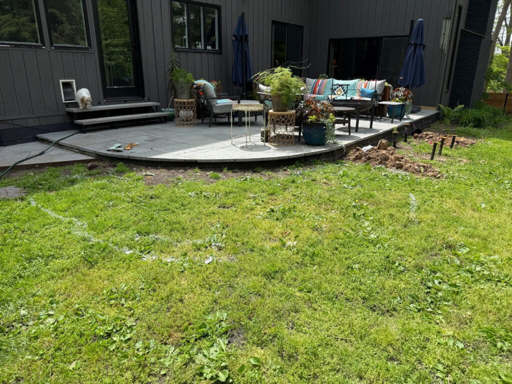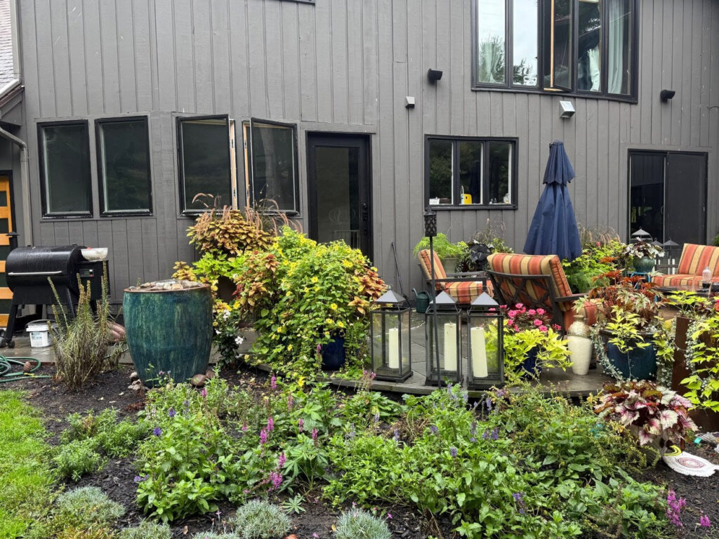Removed lawn area and installed a pollinator garden and simple water feature.