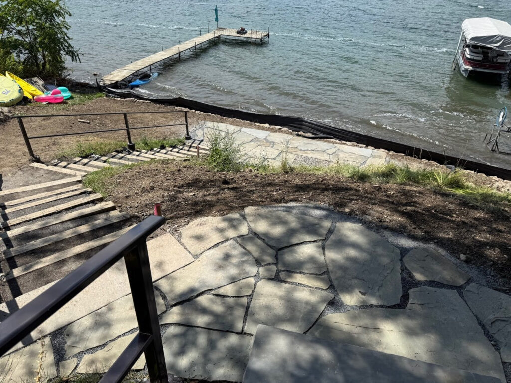 Soil preparation for planting and seeding took place after the stairs, upper and lower patios were stabilized. The planting specifications include tall native grasses, fast growing assertive perennials and lawn pathways designed as buffer vegetation between hard services and the lake.