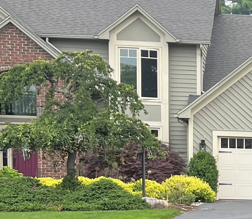 Plantings are important to stagger textures, heights, colors, and bloom times. You can even see the bright burst of color with the neon lime colored sumac. This particular garden is very low maintenance as everything fits together at its ideal height and requires almost no pruning.